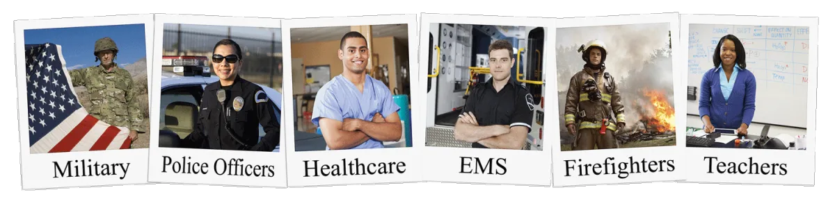 Programs and discounts available for Military (Active, Reserve, and Veterans), Law Enforcement, Healthcare Professionals, EMS and First Responders, Firefighters, Teachers